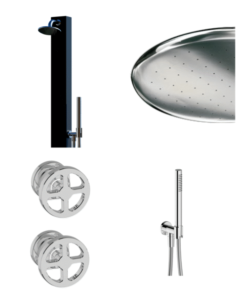 Douche en acier inoxydable AISI 316L avec corps finition noire et accessoires en acier inoxydable. Douche extérieure.